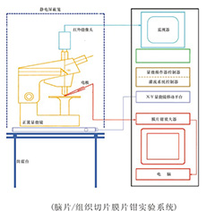 该系统是有IR摄像头和监视器两部分组成,其主要目的是为了观看细胞和电极,由于切片的厚度,普通的光学摄像头不能够看清,必须需要红外摄像头。常用的摄像头是美国的Dagan-MTI公司的IR-2000 Camera.